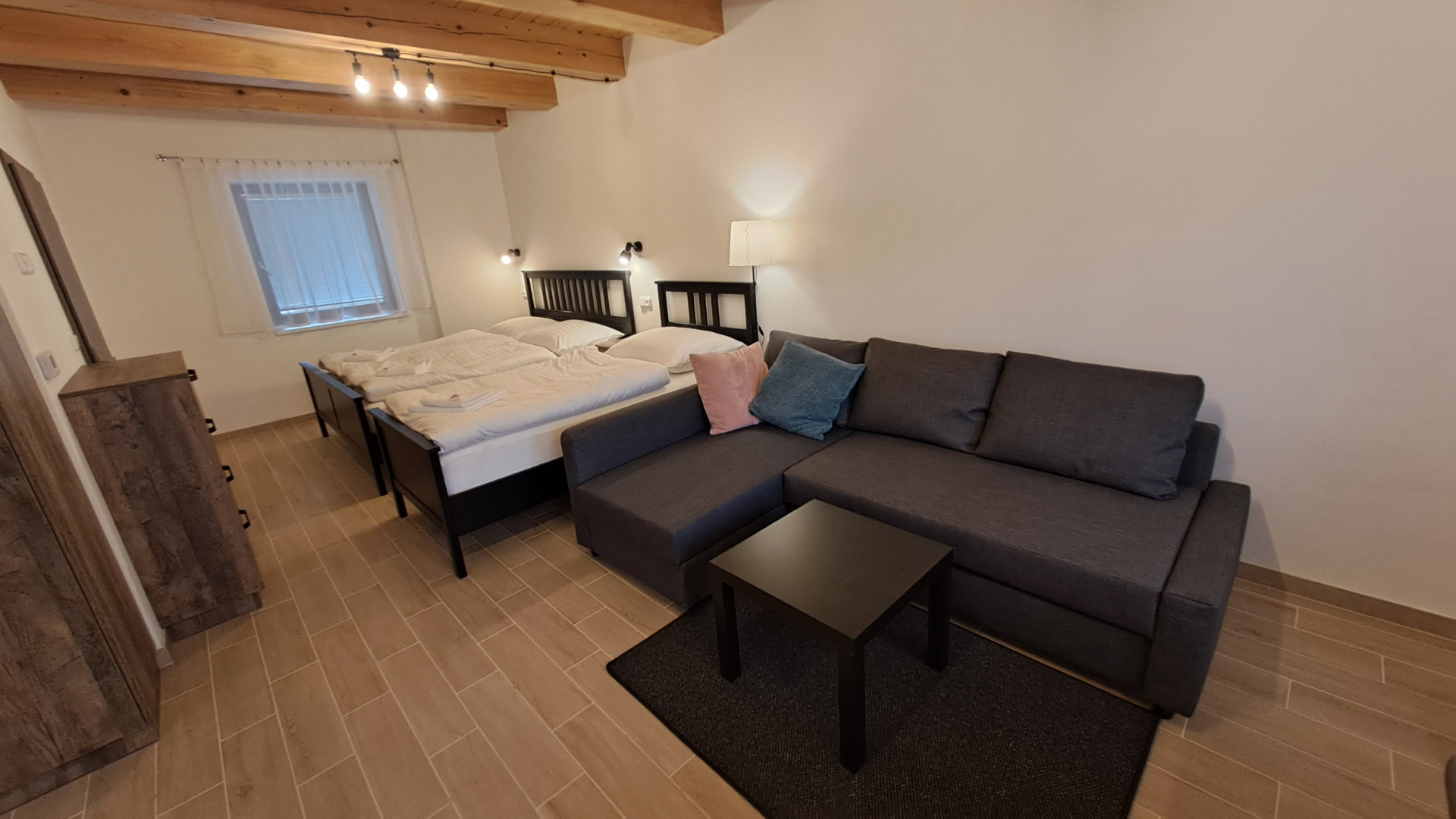 Součástí apartmánu je jedna samostatná postel o rozměru 90×200 cm, prostorná manželská postel 180×200 cm a pohodlná rozkládací pohovka, která slouží jako další plnohodnotné lůžko. Dispozice je navržena tak, aby poskytovala dostatek soukromí i komfortu pro více osob.
